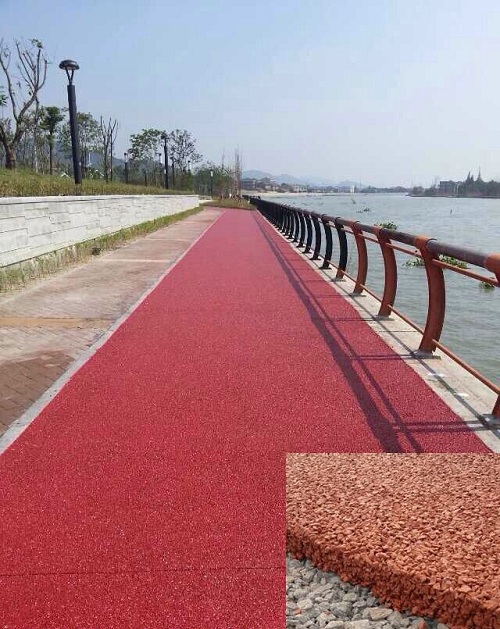 在傳統的熱碾式路面工藝中,鋪筑好瀝青砂膠層之后,以彩色石料按照每平方米 5kg 以上的用量代替部分普通石料,在瀝青砂膠層仍保持足夠溫度時散布碾壓,使石料部分嵌入瀝青砂膠層內,即可形成彩色路面。彩色石料的用量決定了這種路面的彩度。